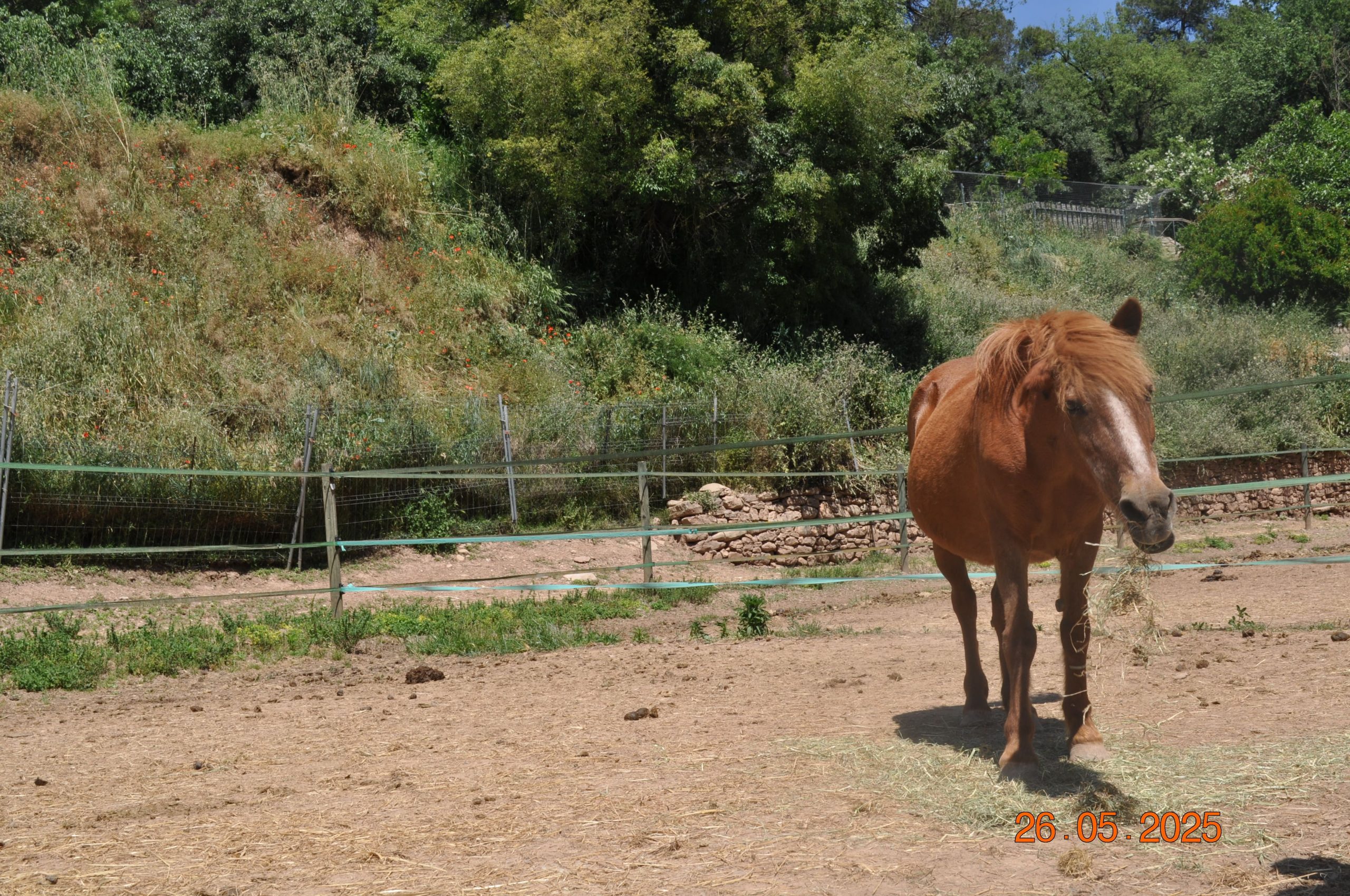 Cuando la rescatamos el otro caballo ya llevaba varios días muerto y a ella creímos que la tendríamos que eutanasiar, pero se salvó casi milagrosamente. la adoptó una tiparraca para “hacer compañía a su caballo” y creímos que era una buena adopción, pero no, era meramente un contrato laboral, cuando al cabo de 8 años el caballo murió, Ambar fue “despedida” y tuvo que regresar al refugio… perdió el mismo día a su amigo de tantos años y su hogar. Ahora ya no saldrá de aquí, no se merece más desgracias. Su carácter es algo esquivo, pero no es para menos…